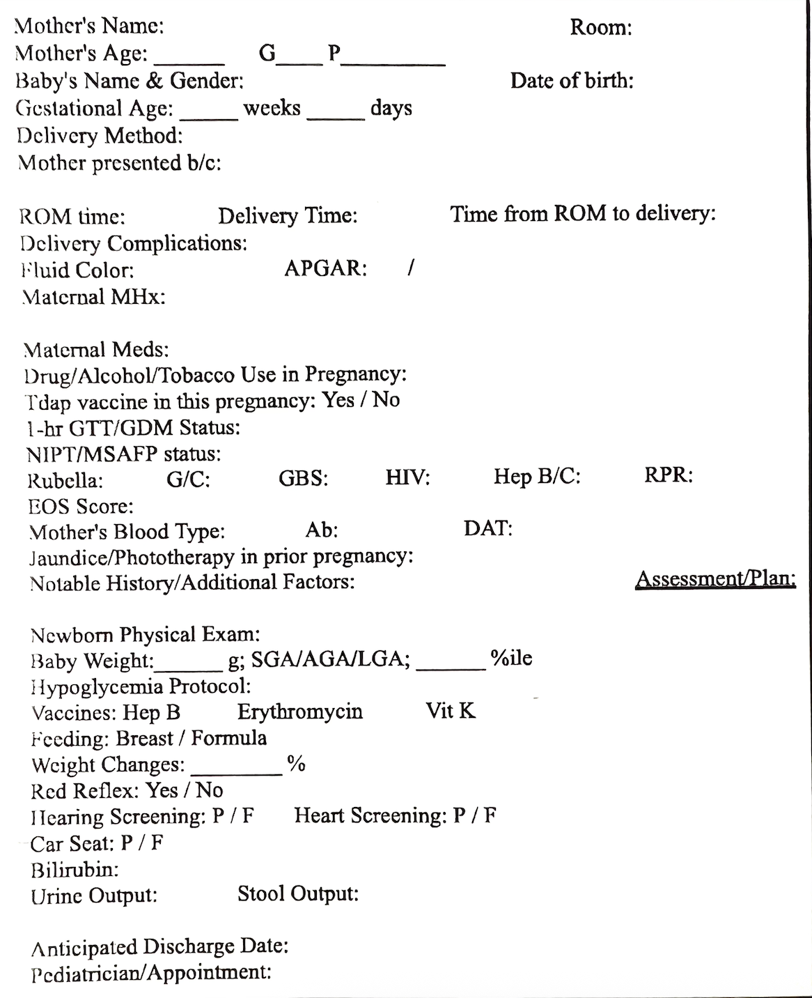 Once a newborn pt is assigned to your attending, fill out the sheet below using mom’s prenatal record. Paper copies will be found near the attendings’ door (hanging on the wall).