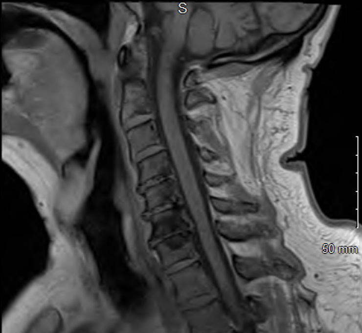 Figure 1. Neck MRI, sagittal view, showing no signs of compression